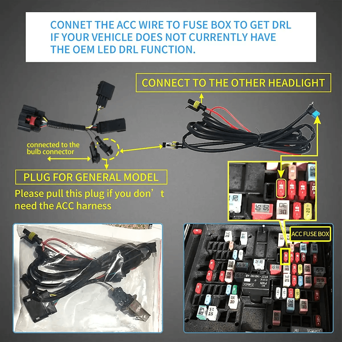 - One pair of ACC Converters. (This item has the same connections and wires as the original Headlights.)