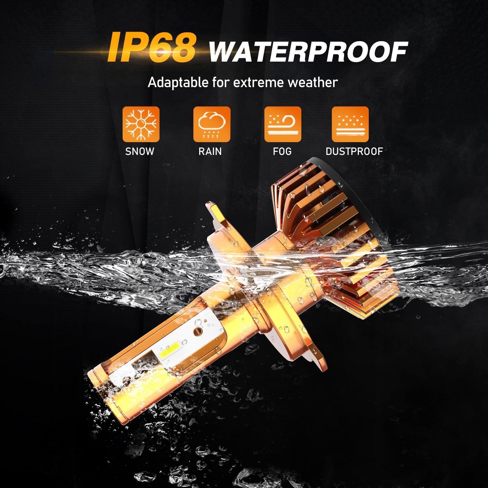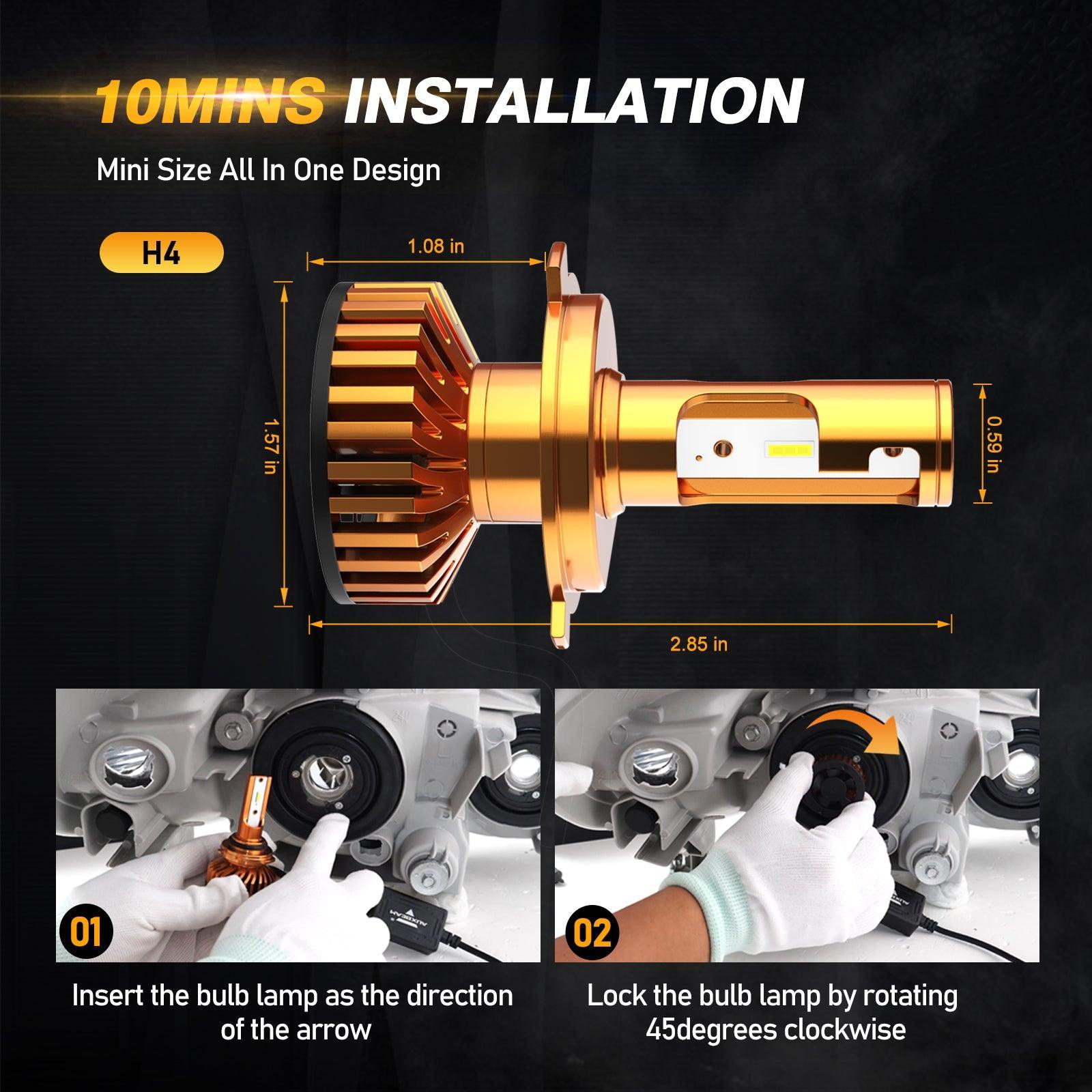 - Las bombillas LED H4 con chips LED CSP de doble cara con iluminación de 360° proporcionan hasta un 300 % más de luz con un color blanco xenón de 6500 K más claro. Flujo luminoso: 10000 lm/juego (5000 lm/bombilla), 3 veces más brillante que la lámpara halógena.