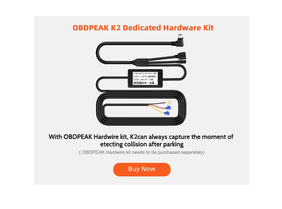 We sell parking monitoring power cables separately and can connect them to the car fuse box according to the instructions. After the car stalls, K2 Pro will remain dormant. When the vehicle sends abnormal vibrations, K2 Pro will quickly wake up and record an emergency video to protect the safety of the car (correctly connecting the cable will not exhaust the car battery)