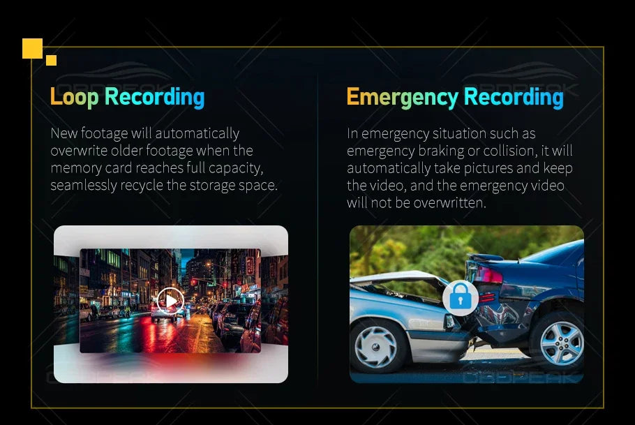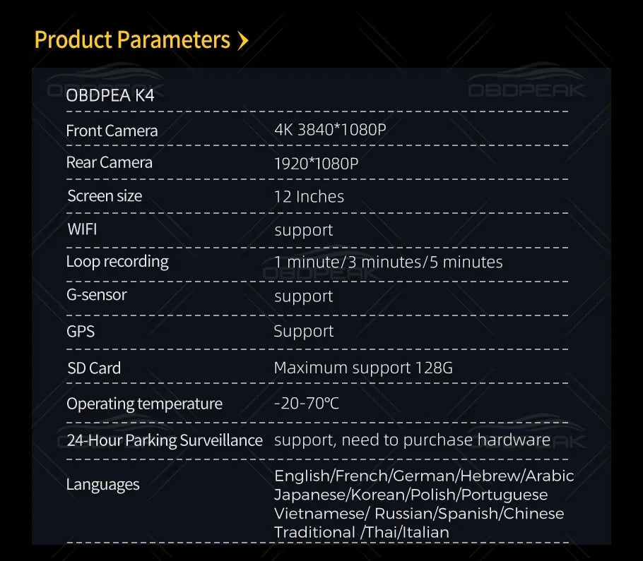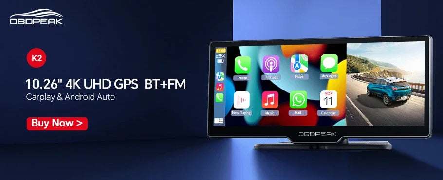 The OBDPEAK K4 recorder uses the latest technology, supports Carplay and Android Auto functions, users can easily and safely make calls, listen to music, send and receive messages, use navigation, support Siri, and more. (Wireless Connections, via BT or WiFi)