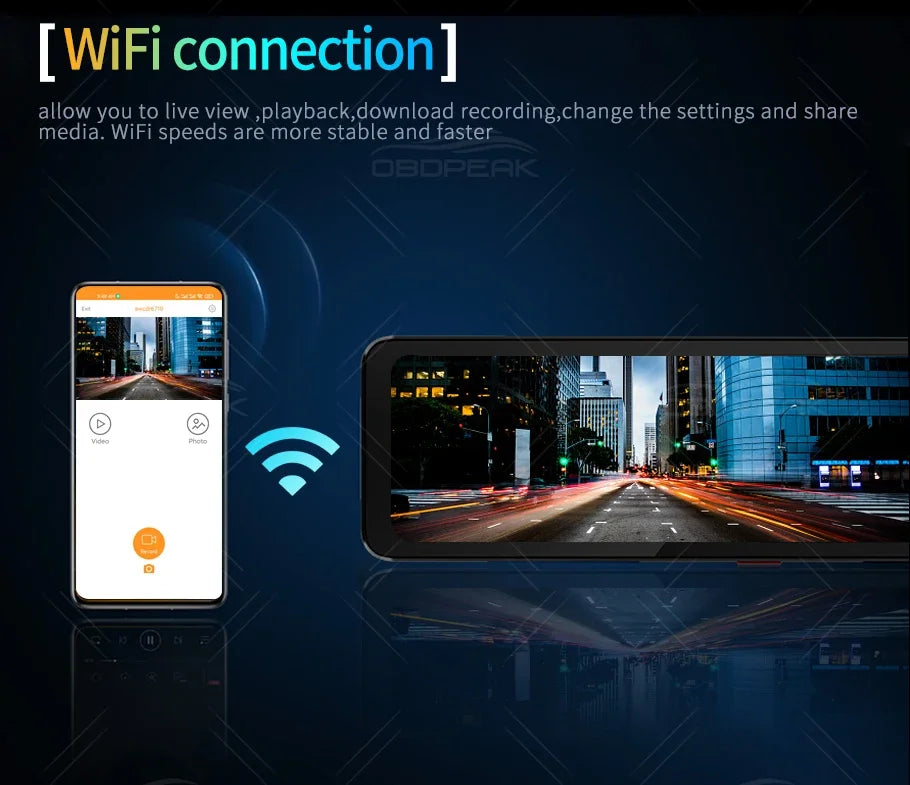 You can control the DVR by connected mobile phone via WiFi, like recording video, the file recorded video from the overwriting, taking photo, playback preview, parameter settings, etc.