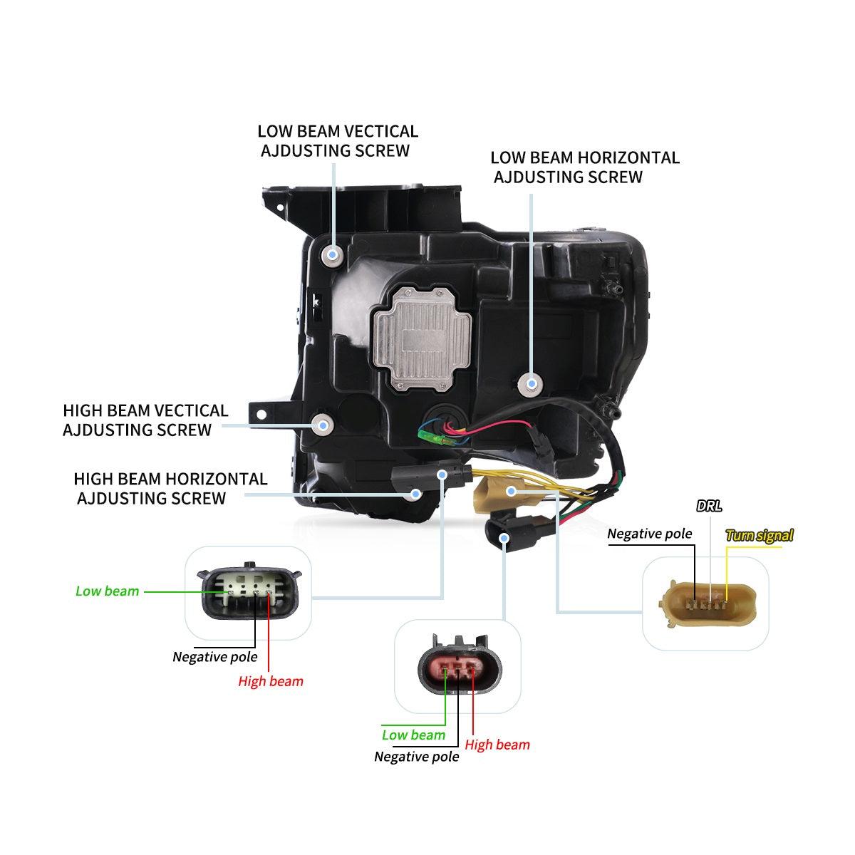- Lighting Functions: High beam, low beam, side marker, DRL w/Dynamic Animation, and sequential Turn signal w/ switchback. (Notice: if don't need the switchback turn signal, open the stabilizer on the bottom of the headlights, disconnect the wire of yellow wire with a label, then the headlights will work as the OE one.)